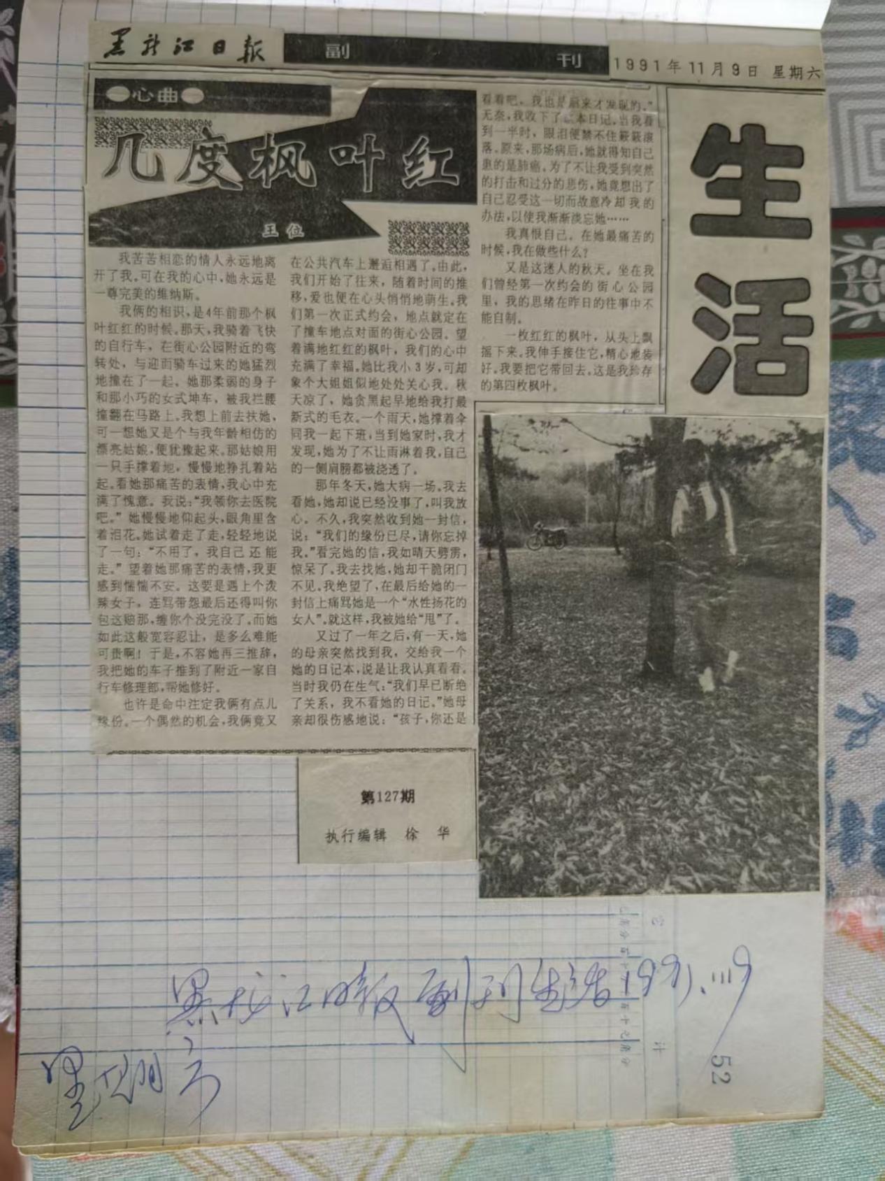 初試牛刀,就有斬獲。這對正迷茫的我來說,無疑是莫大的鼓舞,于是我起早貪晚開始追夢。徐老師在她的“生活”版上接連又發(fā)表了我的散文隨筆《幾度楓葉紅》《保留一片自由的天地》等文章。后來《黑龍江日報(bào)》的“讀者之頁”版和“社會(huì)新聞”版也開始發(fā)表我的稿子。每天點(diǎn)燈熬油,我忙得不亦樂乎。