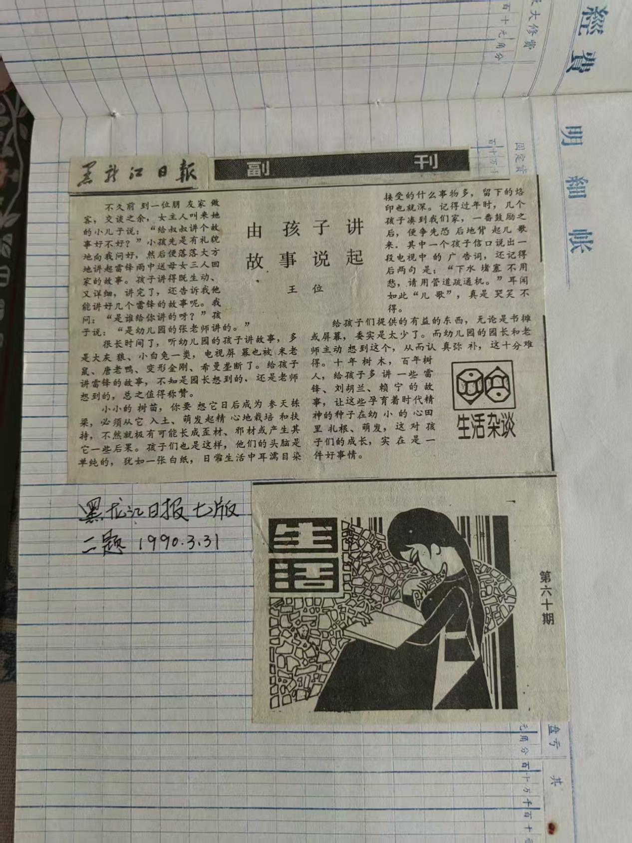 第二天,愛人把報(bào)紙從廠子帶了回來。標(biāo)題是《由孩子講故事說起》。這是我在《黑龍江日報(bào)》發(fā)表的第一篇稿子。發(fā)在徐華老師編輯的副刊“生活”版的“生活雜談”欄目,而且是顯著二題。這讓我萬萬沒有想到。